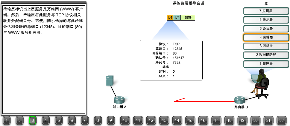 3. 传输层标识上层服务是万维网(WWW)客户端。然后,传输层将此服务与TCP协议相关联并分配端口号。它使用随机选择的与此所建回话相关联的源端口(12345),目的端口(80)与www服务相关联。