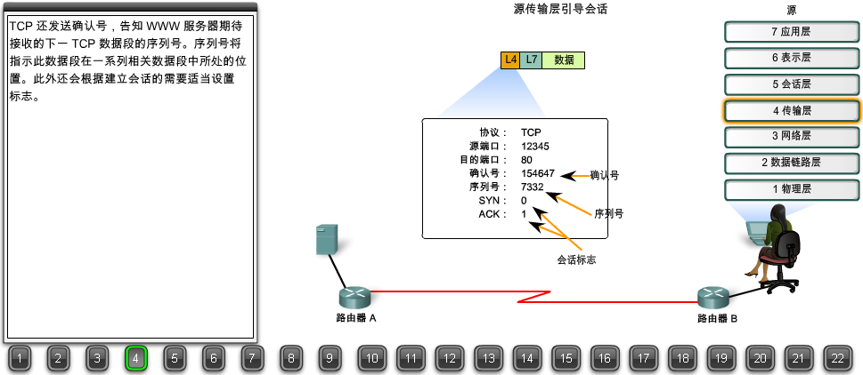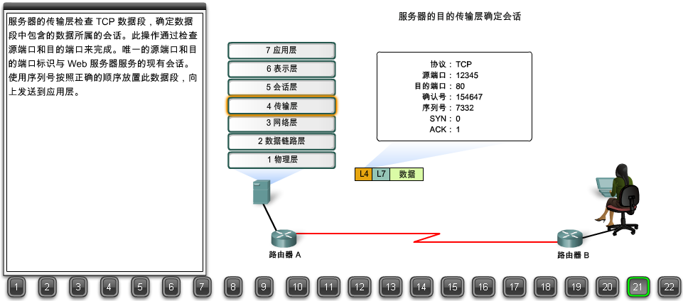 21. 服务器的传输层检查TCP数据段,确定数据段中包含的数据所属的会话。此操作通过检查源端口和目的端口来完成。唯一的源端口和目的端口标识与Web服务器服务的现有会话。使用序列号按照正确的顺序放置此数据段,向上发送到应用层。