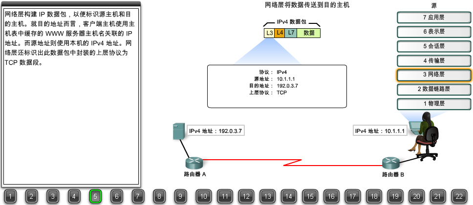 5. 网络层构建IP数据包,以便标识源主机和目的主机。就目的地址而言,客户端主机使用主机表中缓存的www服务器主机名关联的IP地址。而原地址则使用本机的IPv4地址。网络层还标识出此数据包中封装的上层协议为TCP数据段。
