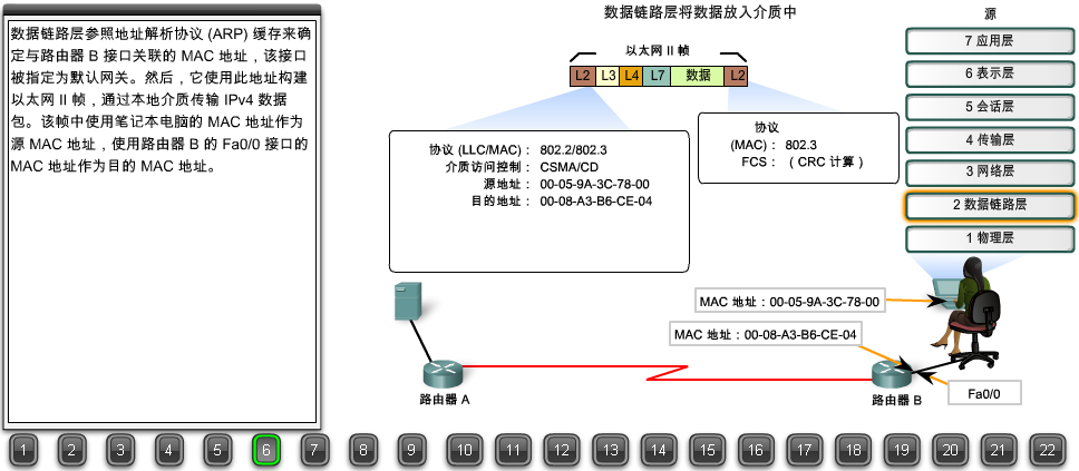 6.数据链路层参照地址解析协议(ARP)缓存来确定与路由器B接口关联的MAC地址,该接口被制定为默认网关。然后,它使用此地址构建以太网II帧,通过本地介质传输IPv4数据包。该帧中使用笔记本电脑的MAC地址作为源MAC地址,使用路由器B的Fa0/0接口的MAC地址作为目的MAC地址。