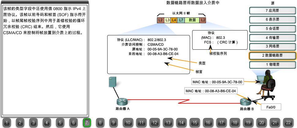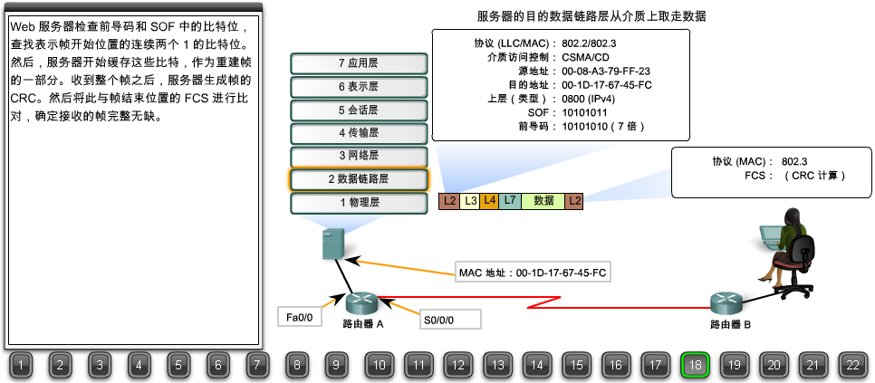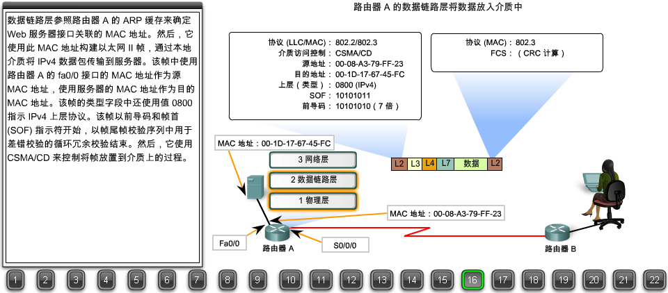 16. 数据链路层参照路由器A的ARP缓存来确定Web服务器接口关联的MAC地址。然后,它使用此MAC地址构建以太网Ⅱ帧,通过本地介质将IPv4数据包传输到服务器。该帧中使用路由器A的fa0/0接口的MAC地址作为源MAC地址,使用服务器的MAC地址作为目的MAC地址。该帧的类型字段中还使用值0800指示IPv4上层协议。该帧以前导码和帧首(SOF)指示符开始,以帧尾帧校验序列中用于差错校验的循环贰余校验结束。然后,它使用CSMA/CD来控制将帧放置到介质上的过程。