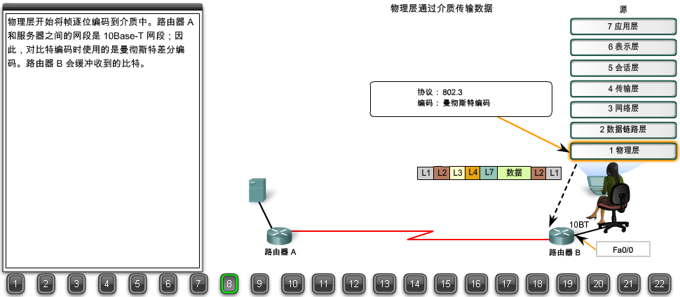 8. 物理层开始将帧逐位编码到介质中。路由器A和服务器之间的网段是10Base-T网段;因此,对此比特编码时使用的是曼彻斯特差分编码。路由器B会缓冲收到的比特。