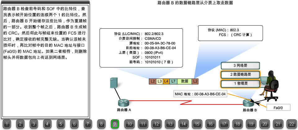 9. 路由器检查前导码和SOF中的比特位,查找表示帧开始位置的连续两个1的比特位。然后,路由器B开始缓存这些比特,作为重建帧的一部分。收到整个帧之后,路由器B生成帧的CRC。然后将此与帧结束位置的FCS进行对比,确定接收的帧完整无缺。当确认该帧未损坏时,再比对帧中的目的MAC地址和接口(Fa0/0)的MAC地址。如果二者相符,则删除帧头并将数据包向上传送到网络层。