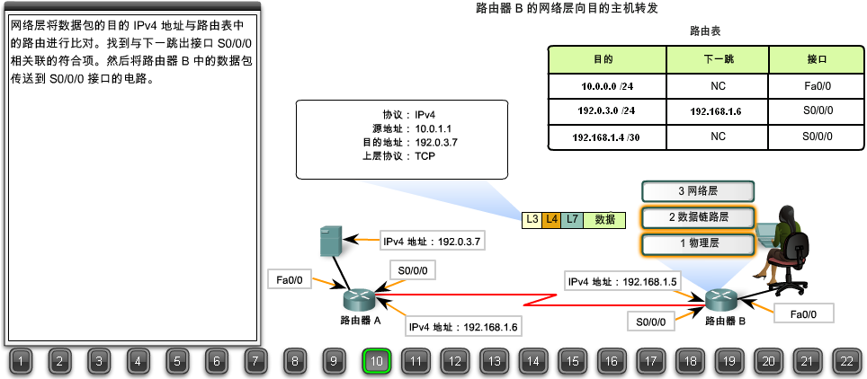 10. 网络层将数据包的目的IPv4地址与路由表中的路由进行比对。找到与下一跳出接口S0/0/0相关联的符合项。然后将路由器B中的数据包传送到S0/0/0接口的电路。
