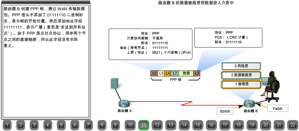 11.路由器B创建PPP帧,通过WAN传输数据包。PPP报头中添加了01111110二进制标志,表示帧的开始位置。然后添加地址字段1111111,表示广播(意思是“发送到所有站点”)。由于PPP是点对点协议,用作两个节点之间的直接链路,所以此字段没有实际意义。