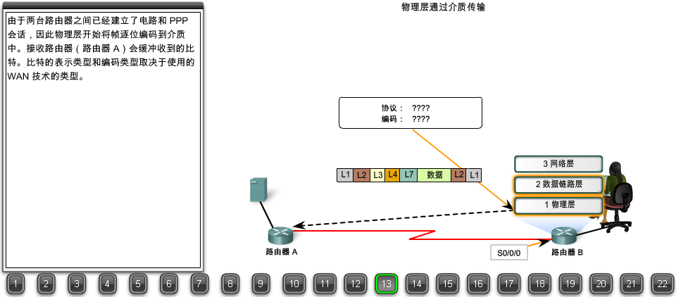 13. 由于两台路由器之间已经建立了电路和PPP会话,因此物理层开始将帧逐位编码到介质中。接收路由器(路由器A)会缓冲收到的比特。比特的表示类型和编码类型取决于使用的WAN技术的类型。