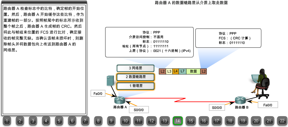 14. 路由器A检查标志中的比特,确定帧的开始位置。然后,路由器A开始缓存这些比特,作为重建帧的一部分。按照帧尾中的标志所示收到整个帧之后,路由器A生成帧的CRC。然后将此与帧结束位置的FCS进行比对,确定接收的帧完整无缺。当确认该帧未损坏时,则删除帧头并将数据包向上传送到路由器A的网络层。