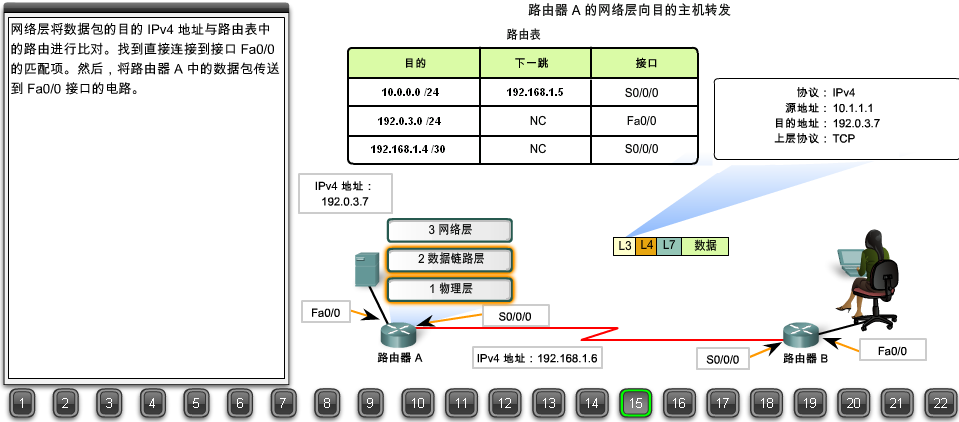 15. 网络层将数据包的目的IPv4地址与路由表中的路由进行比对。找到直接连接到接口Fa0/0的匹配项。然后,将路由器A中的数据包传送到Fa0/0接口的电路。