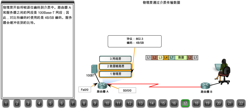 17. 物理层开始将帧逐位编码到介质中。路由器A和服务器之间的网段是100Base-T网段;因此,对比特编码时使用的是4B/5B编码。服务器会缓冲收到的比特。