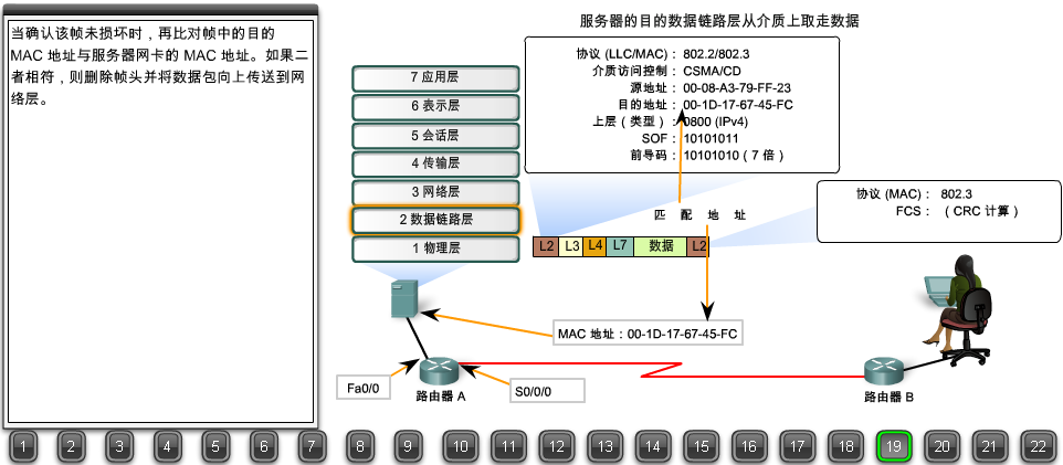 19. 当确认该帧未损坏时,再比对帧中的目的MAC地址与服务器网卡的MAC地址。如果二者相符,则删除帧头并将数据包向上传送到网络层。