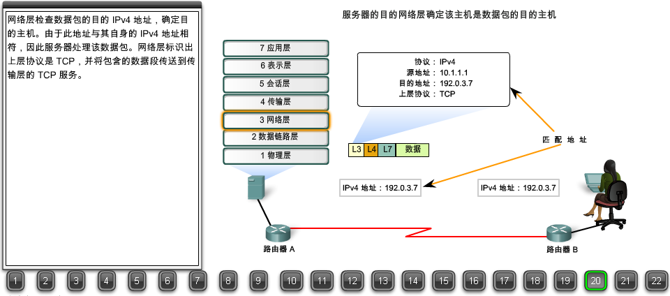 20. 网络层检查数据包的目的IPv4地址,确定目的主机。由于此地址与其自身的IPv4地址相符,因此服务器处理该数据包。网络层标识出上层协议是TCP,并将包含的数据段传送到传输层的TCP服务。
