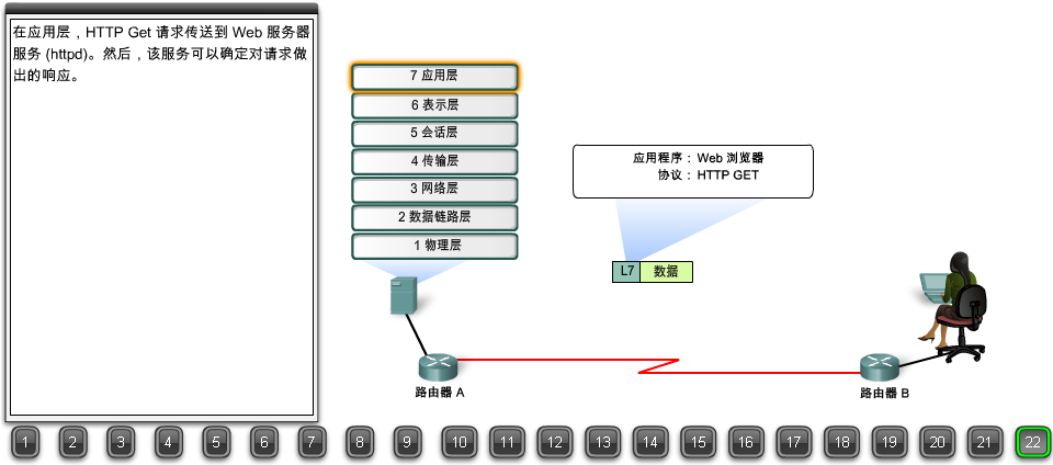 22. 在应用层,HTTP Get请求传送到Web服务器服务(httpd)。然后,该服务可以确定对请求做出的响应。