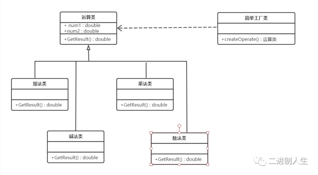 这个示例里头,定义了一个运算基类,派生出具体的加减乘除子类;简单工厂类提供了一个生产函数createOperate(),通过给它传入"+、-、*、/"来构建具体的加减乘除类。
