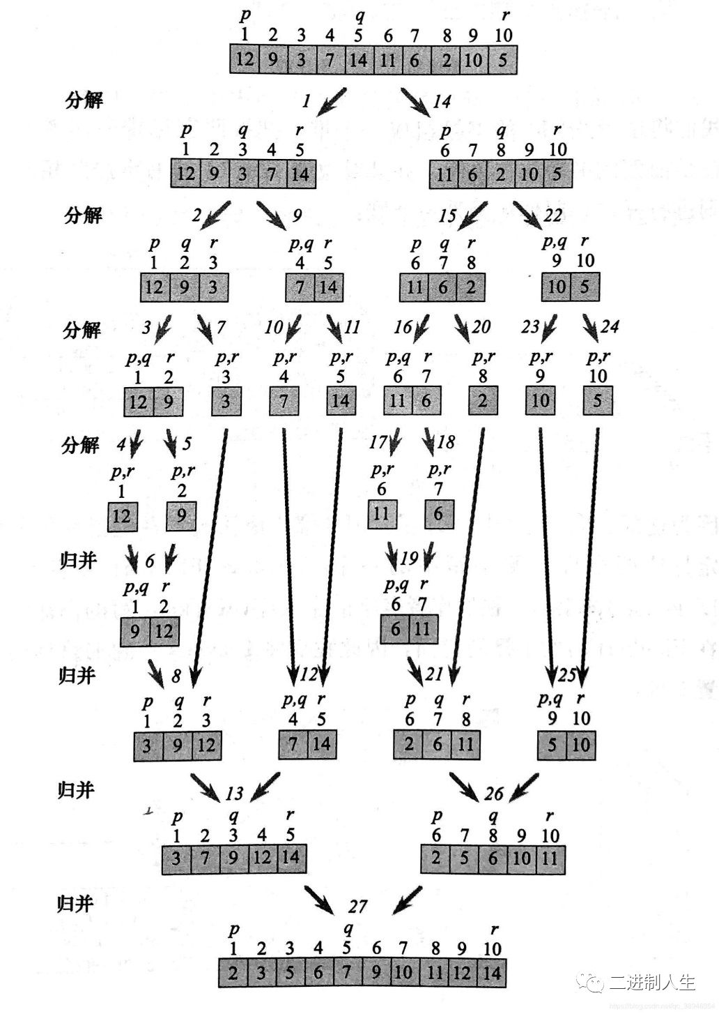 归并排序是分治法的一个典型的应用。先使每个子序列有序,再将两个有序子序列合并成一个有序表。
