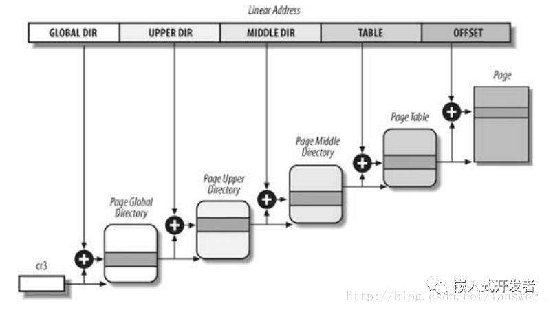 说明:控制寄存器cr3中存放了页目录PGD的物理地址,通过cr3寄存器可以找到页目录,不同的进程有不同的页目录地址。进程切换时,操作系统负责把页目录地址装入CR3寄存器。备注:这是在32位pc机上的情况,arm没有cr3寄存器,放在了另外的地方,后面会介绍。