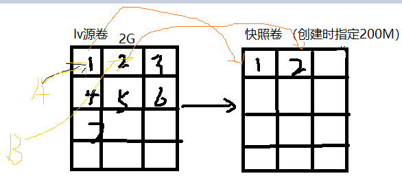 快照做好后,随着时间的推移,源卷里的东西会发生改变。如数据1、2改写成了A、B,如下图: