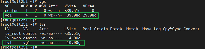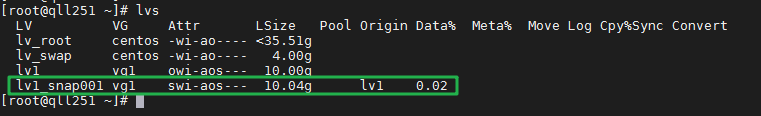 在创建快照之前,我们先查看下系统当前的LV及VG的使用情况