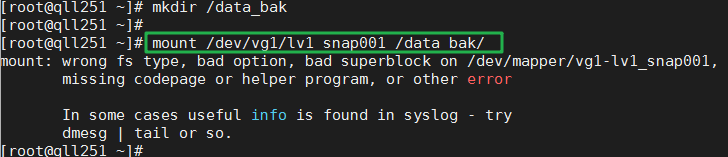 快照与待备份的逻辑卷(LV)必须要在同一个VG下,否则创建快照会失败。