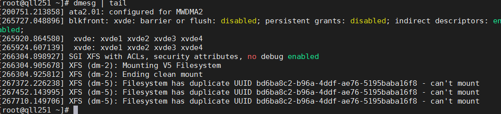 ❝如果逻辑卷使用的文件系统为xfs,挂载快照卷时会报错的。因为xfs不允许相同的UUID文件系统直接挂载(快照是LVM的克隆,因此UUID是一致的)。要解决这个办法,要么修改其UUID,要么带上
