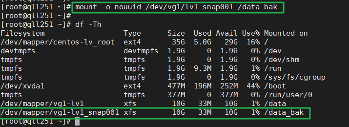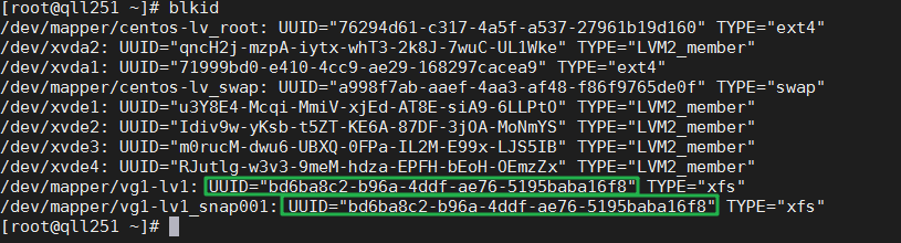 这时会发现:逻辑卷lv1与快照卷lv1_snap001共用同一个UUID了。通过查询资料,得出以下结论: