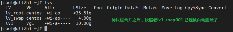 注意,合并快照的操作会自动删除快照数据卷,如下图所示: