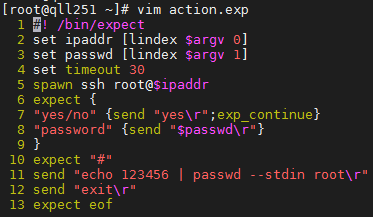 时,自动输入密码并回车。第11行不用多解释了吧,登录上远程服务器后,将密码修改为123456 第12及13行表示退出expect;其中 expect eof
