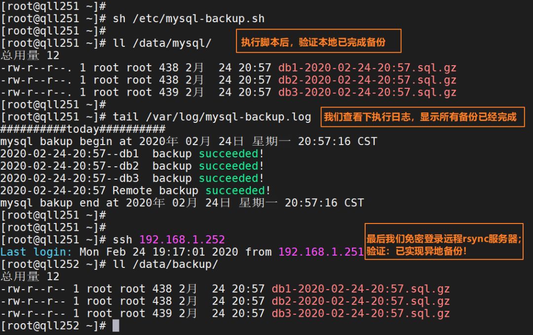 #! /bin/bash#Save sa /etc/mysql-backup.shBAKDIR="/data/mysql"MYSQLUSR="root"MYSQLPW="123123"LOG=/var/log/mysql-backup.logNOW=`date +%Y-%m-%d-%H:%M`[ ! -d $BAKDIR ] && mkdir -p $BAKDIRecho "##########today##########" >>$LOGecho "mysql backup begin at `date`" >>$LOGfor db in db1 db2 db3domysqldump -u$MYSQLUSR -p$MYSQLPW $db | gzip > $BAKDIR/$db-$NOW.sql.gzif [ $? == 0 ];thenecho "$NOW--$db backup succeeded!" >> $LOGelseecho "$db backup failed!" >> $LOGfidonersync -az --delete /data/mysql/* root@192.168.1.252:/data/backup >/dev/null 2>&1if [ $? == 0 ];thenecho "$NOW Remote backup succeeded!" >> $LOGelseecho "$NOW Remote backup failed!" >> $LOGfifind $BAKDIR -type f -mtime +60 -name "*.gz"|xargs rm -rfecho "mysql bakup end at `date`" >>$LOG