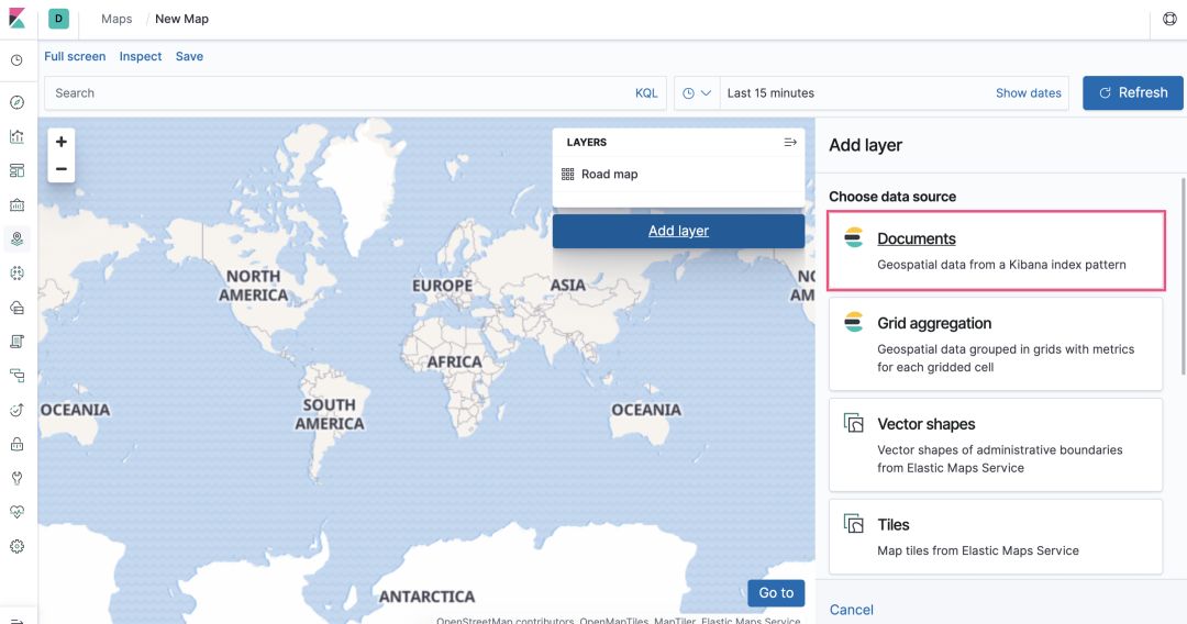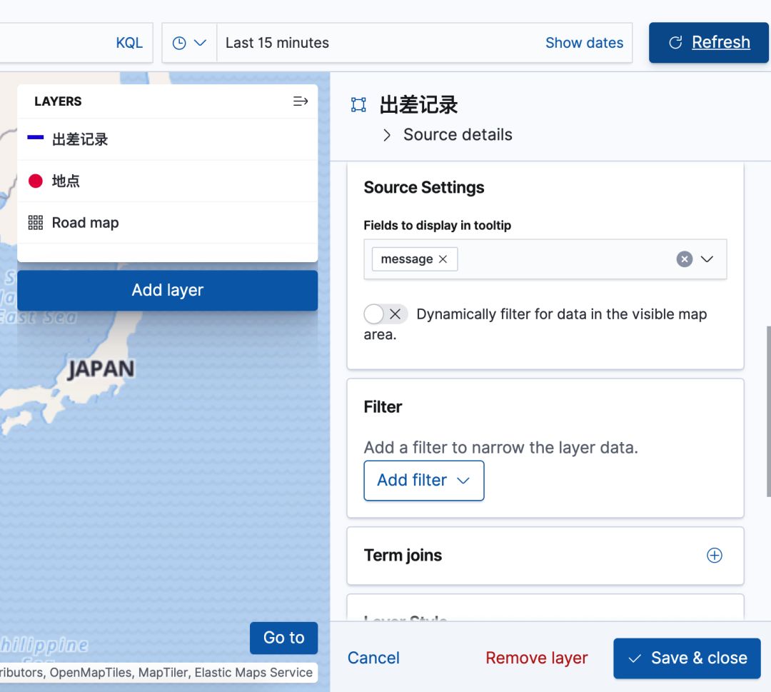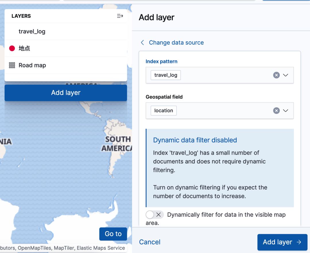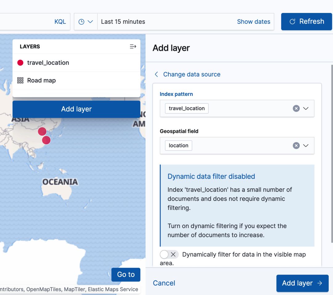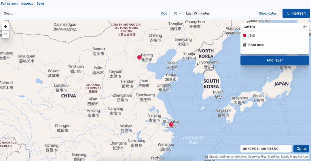 首先选择 travel_location 这个索引,location 字段会自动识别,左侧地图会自动出现红点。