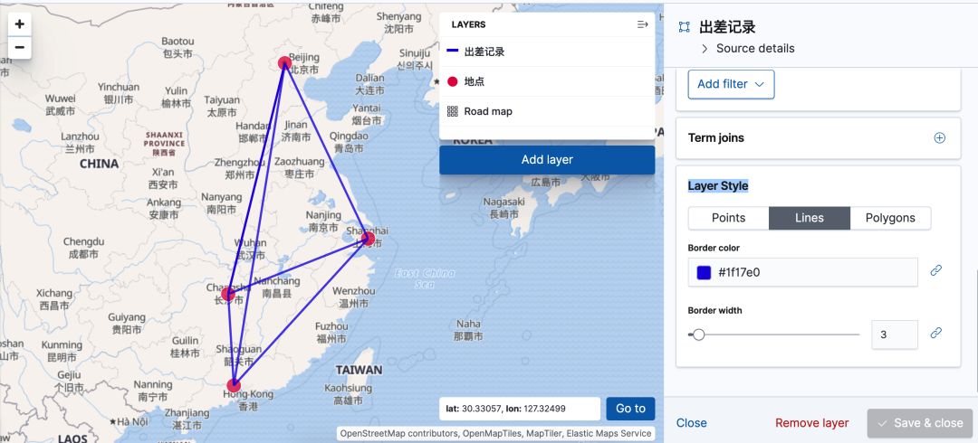 设置名称为出差记录,设置显示字段为 message,并调整颜色为蓝色, Layer Style 设置为Lines, 并适当调整线条粗细,如下图: