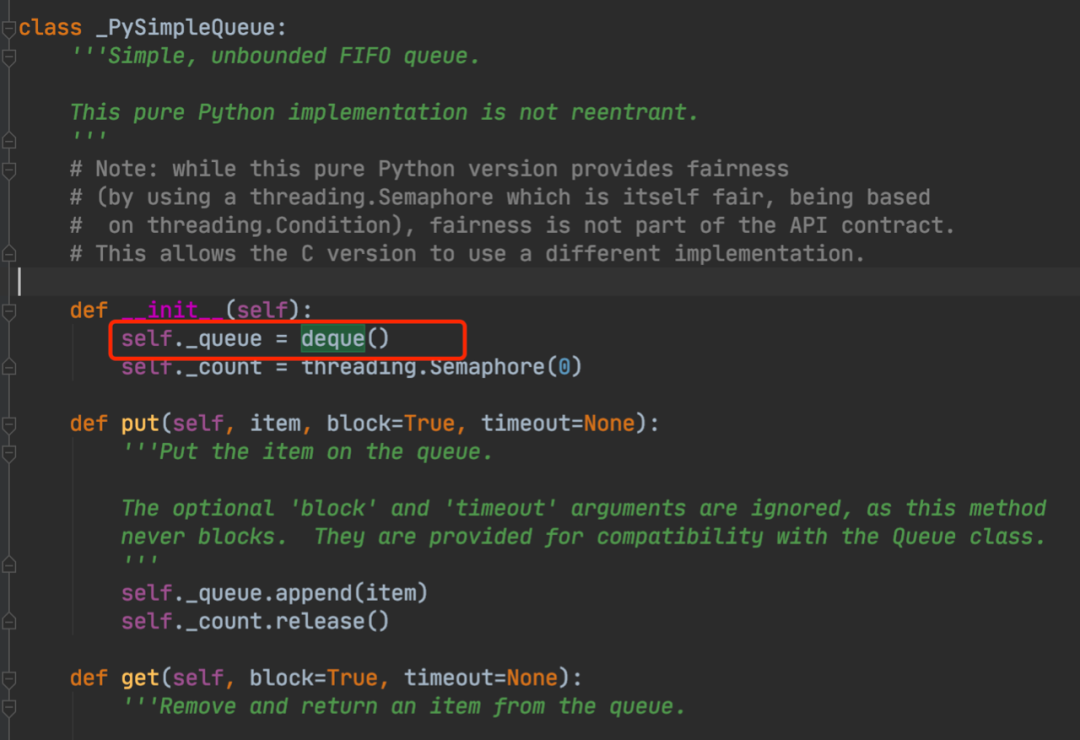 无界的 FIFO 队列构造函数。简单的队列,缺少任务跟踪等高级功能。无界的意思是,SimpleQueue 是基于双向队列实现的 (python 内置方法 deque,不需要锁)。