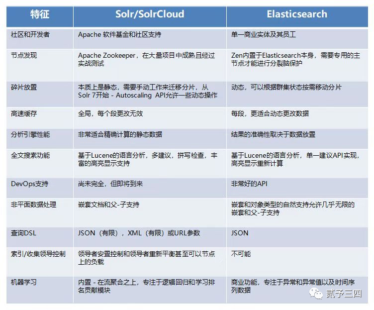 ES 和 Solr 都是基于 Lucene 的全文搜索引擎,他们的特征差异对比如下: