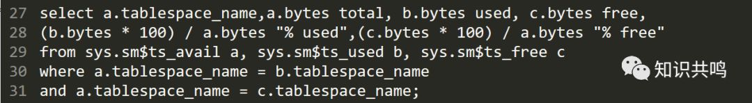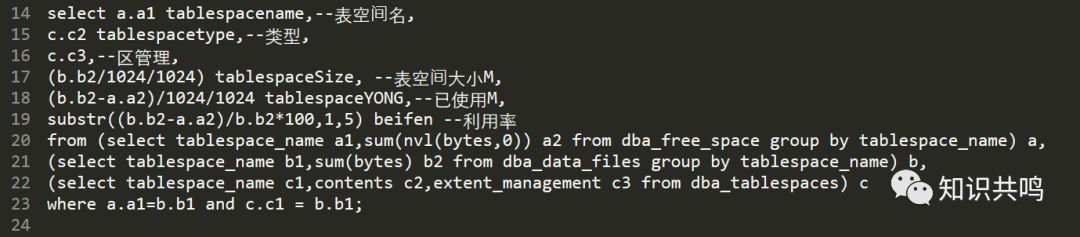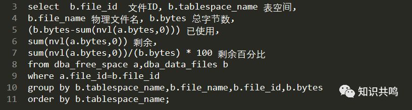 该语句通过查询dba_free_space,dba_data_files,dba_tablespaces这三个数据字典表,得到了表空间名称,表空间类型,区管理类型,以”兆”为单位的表空间大小,已使用的表空间大小及表空间利用率。dba_free_space表描述了表空间的空闲大小,dba_data_files表描述了数据库中的数据文件,dba_tablespaces表描述了数据库中的表空间。