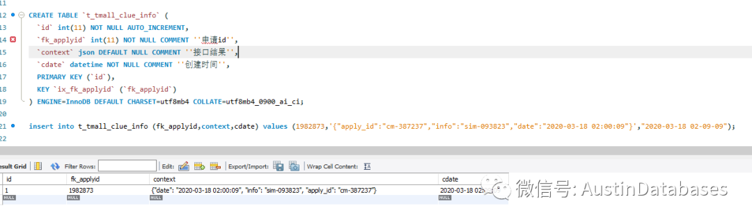 `context` json DEFAULT NULL COMMENT ''接口结果'',