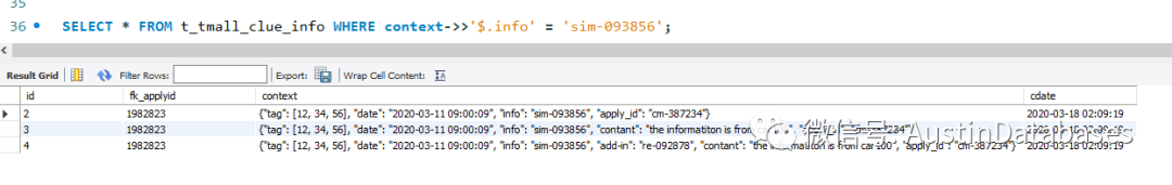 SELECT * FROM t_tmall_clue_info WHERE context->>'$.info' = 'sim-093856';
