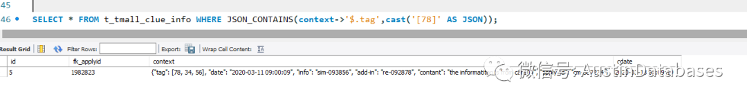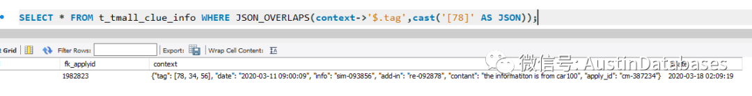 SELECT * FROM t_tmall_clue_info WHERE JSON_CONTAINS(context->'$.tag',cast('[78]' AS JSON));