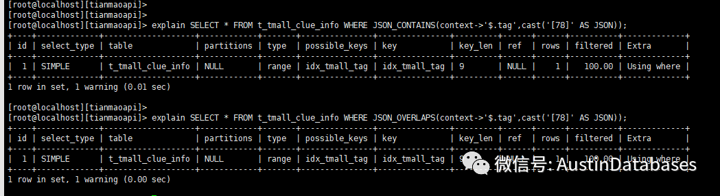 Json_contains 和 json_overlaps 之间的区别是,一个包含数组中的值某即可,另一个不行,必须是你查询的数组的值都包含才可以。