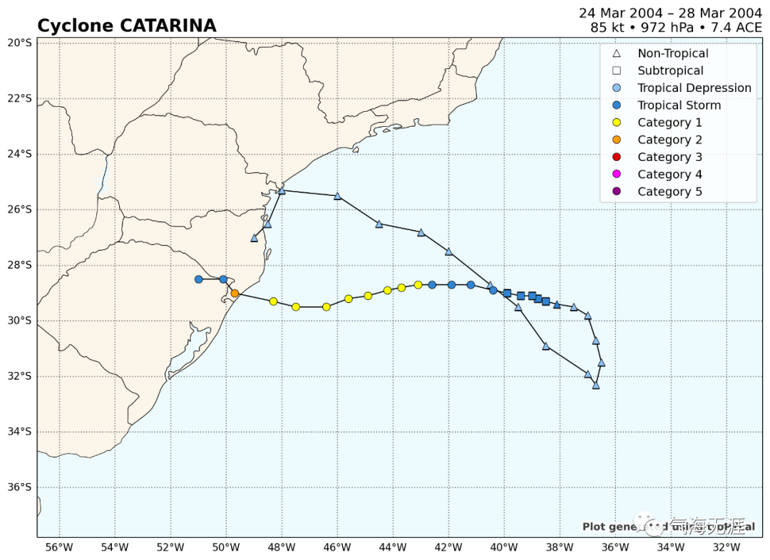 Cyclone Catarina_ (2004) was an extremely rare hurricane-force tropical cyclone that developed in the South Atlantic basin, which normally doesn't see tropical cyclone activity, and subsequently made landfall in Brazil. The "Catarina" name is unofficial; it was not assigned a name in real time, and JTWC assigned it the ID "AL502004". Recall that when reading in the IBTrACS dataset previously, we set Catarina=True. This read in data for Cyclone Catarina from a special post-storm reanalysis from McTaggart-Cowan et al. (2006). Let's make a plot of Catarina's observed track and intensity per this reanalysis: