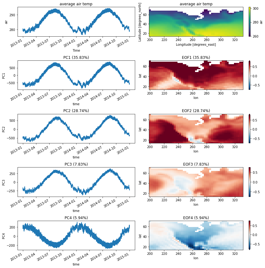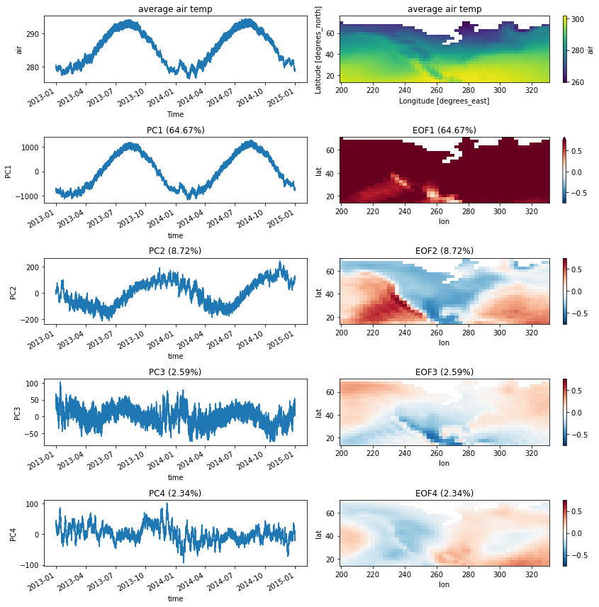 visualization(da, s_pcs, s_eofs_da, s_evfs)