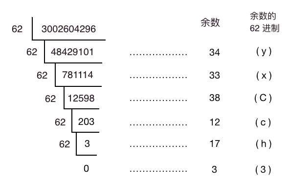 有人说人这个域名还是有点长,还有一招,3002604296 得到的这个哈希值是十进制的,那我们把它转为 62 进制可缩短它的长度,10 进制转 62 进制如下: