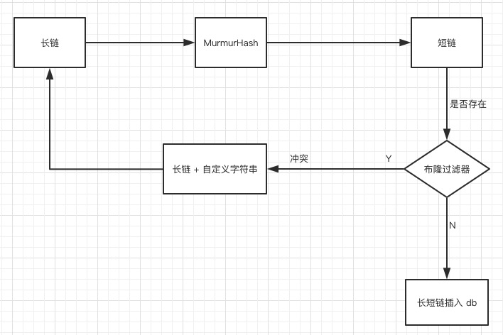 将长链(lurl)经过 MurmurHash 后得到短链。 再根据短链去 short_url_map 表中查找看是否存在相关记录,如果不存在,将长链与短链对应关系插入数据库中,存储。 如果存在,说明已经有相关记录了,此时在长串上拼接一个自定义好的字段,比如「DUPLICATE」,然后再对接接的字段串「lurl + DUPLICATE」做第一步操作,如果最后还是重复呢,再拼一个字段串啊,只要到时根据短链取出长链的时候把这些自定义好的字符串移除即是原来的长链。