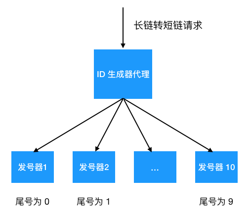 用 Redis 是个不错的选择,性能好,单机可支撑 10 w+ 请求,足以应付大部分的业务场景,但有人说如果一台机器扛不住呢,可以设置多台嘛,比如我布置 10 台机器,每台机器分别只生成尾号0,1,2,... 9 的 ID, 每次加 10 即可,只要设置一个 ID 生成器代理随机分配给发号器生成 ID 就行了。