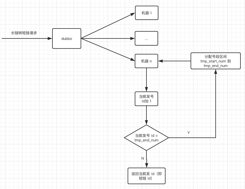 当长链转短链的请求打到某台机器时,先看这台机器是否分配了短链号段,未分配就往发号表插入一条记录,则这台机器将为短链分配范围在 tmp_start_num 到 tmp_end_num 之间的 id。从 tmp_start_num 开始分配,一直分配到 tmp_end_num,如果发号 id 达到了 tmp_end_num,说明这个区间段的 id 已经分配完了,则再往发号表插入一条记录就又获取了一个发号 id 区间。