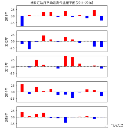4plt.title('徐家汇站月平均最高气温距平图[2011-2016]',fontsize=10,fontproperties=ziti)