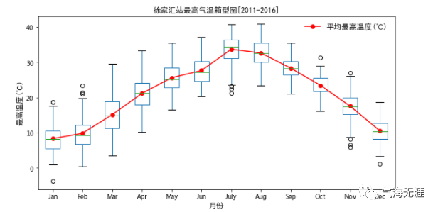 18plt.title('徐家汇站最高气温箱型图[2011-2016]',fontsize=10,fontproperties=ziti)