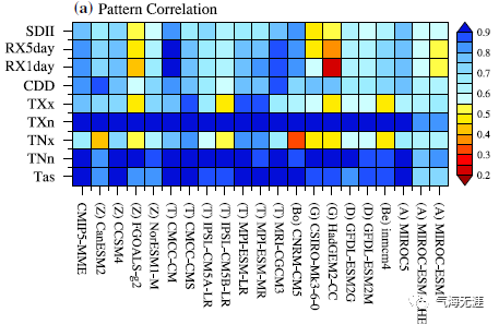 热力图是一种二维可视化的方法,它显示了不同颜色代表的特定现象的大小变化。总体来说是一种数据可视化技术,可以显示一组数据点在不同xy的设置下的特征。现在已经有很多高水平期刊开始更多的使用热力图,比如下图中每一个格点的值代表是相关系数,从色标的颜色来看颜色冷色调越深就代表相关系数的值越高,从而说明相关性最好。图中可以得到结论:CMIP5的各个模式间的数据在TXn都表现出比较好的相关性。