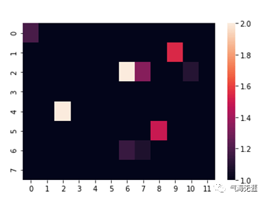 上面热力图中的值分布在2到-2之间,然后我们的把色标值在1到2之间看一下变化。我们可以看到不同的颜色色调,其中较高的值是淡白色,范围较小的值是深红色。在下面的例子中,我们使用了一个vmin和vmax这2个参数,它允许我们设置热力图的显示范围。我们可以使用这个参数来过滤我们需要的值,可以我们在热力图内部设置最小和最大限制。我们已经将热图的最小限制设置为1,最大值设置为2。因此,热图只显示1和2的值,而所有其他不属于最小和最大限制的值在热力图中显示为上下2个极值。