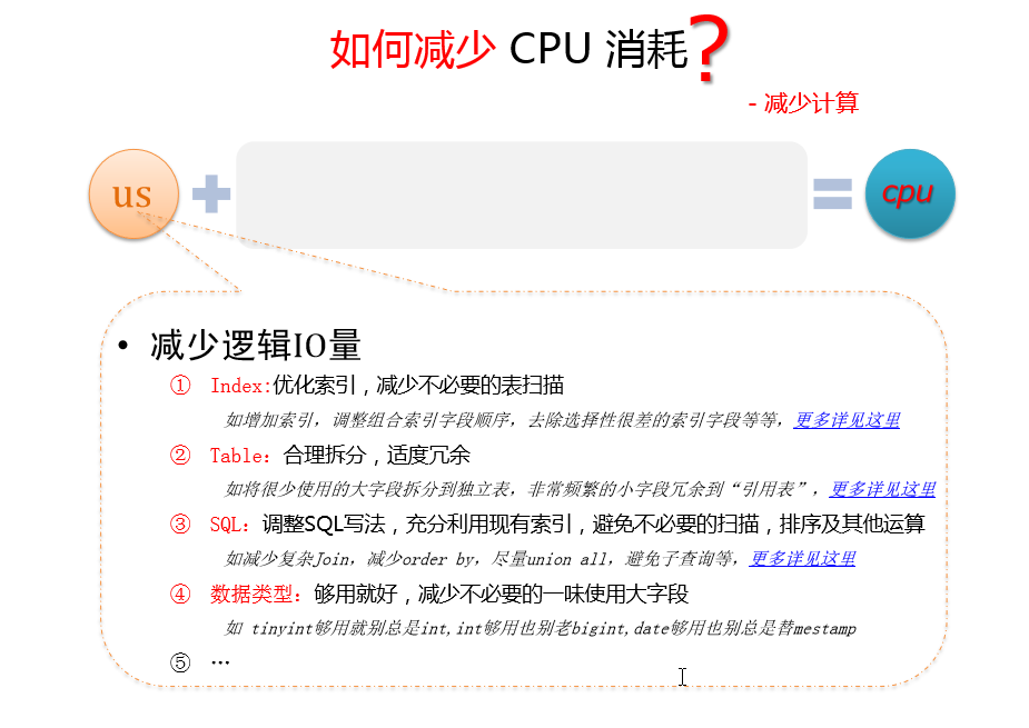 如减少复杂join,减少order by,尽量union all,避免子查询等数据类型,够用就好,减少不必要使用大字段