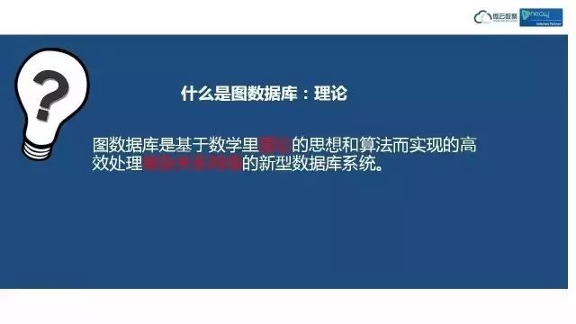 什么是图数据库,从理论依据来看,不是图形、图片的处理,而是基于数学里的图论的理论和算法而实现的高效处理复杂关系网络的新型数据库系统。大家都学过图论,图论里处理的就是点和线的关系,还有最小路径、最短路径、最佳运输路径等等。图数据库就是基于图论而实现的数据库系统,和我们知道的mySQL、Oracle以及Hadoop思路完全不一样。它实际上就是处理关系的、处理网络的数据库系统。