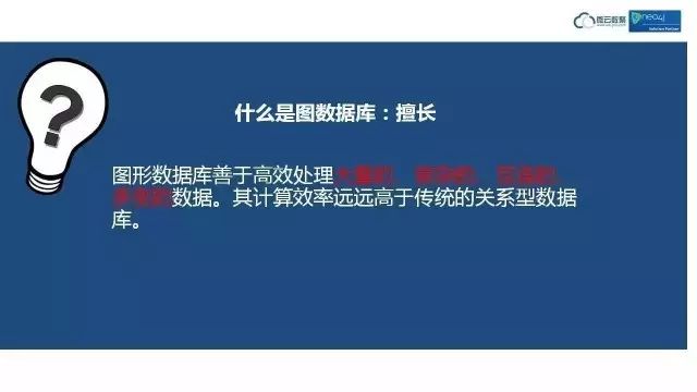 那么我们从另一个角度看,图数据库是善于处理大量的、复杂的、互联的、多变的数据。它处理这些数据的效率,远远高于关系型数据库。