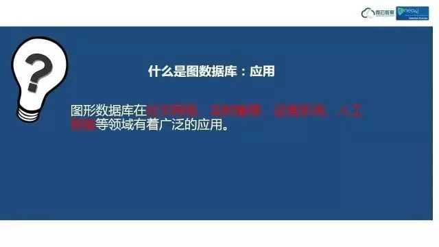 从应用角度来看,图数据库适合于哪些方面呢:例如领英的社交网络、沃尔玛的零售商品实时推荐、征信系统(在中国应用征信系统前景非常好)、人工智能(如阿法狗)。如果使用图数据库来记录数据就会非常简单。在这几个领域有很广泛的应用,当然,不仅仅是这些方面,其他方面也有很多的应用。今天跟大家介绍这些,只是抛砖引玉,大家可举一反三,在自己的行业领域找到广泛应用。